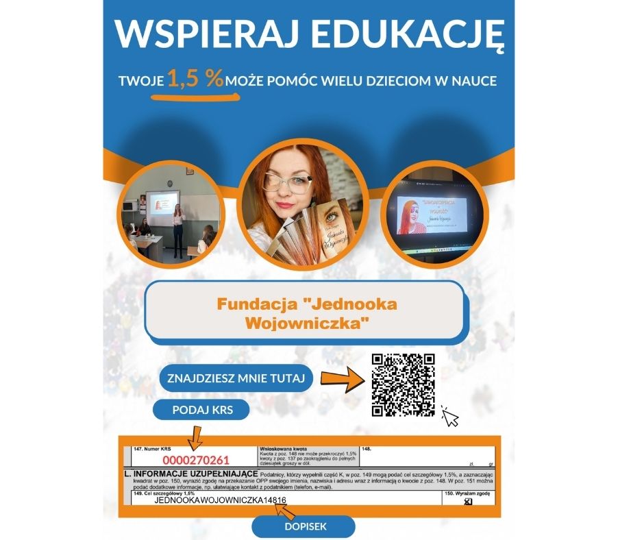To właśnie z tym walczy Fundacja Jednooka Wojowniczka. Staramy się sprawić, by wspomniane wyżej sytuacje przestały mieć miejsce. Każda złotówka z Twojego 1,5% podatku pozwala nam docierać do szkół i pokazywać młodzieży, że ich życie ma gigantyczną wartość.